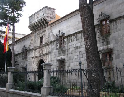 Hermosa fachada protegida por un matacán de ocho grandes ménsulas, edificado en 1520 por Vasco de la Zarza. Al interior patio columnado.