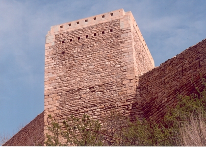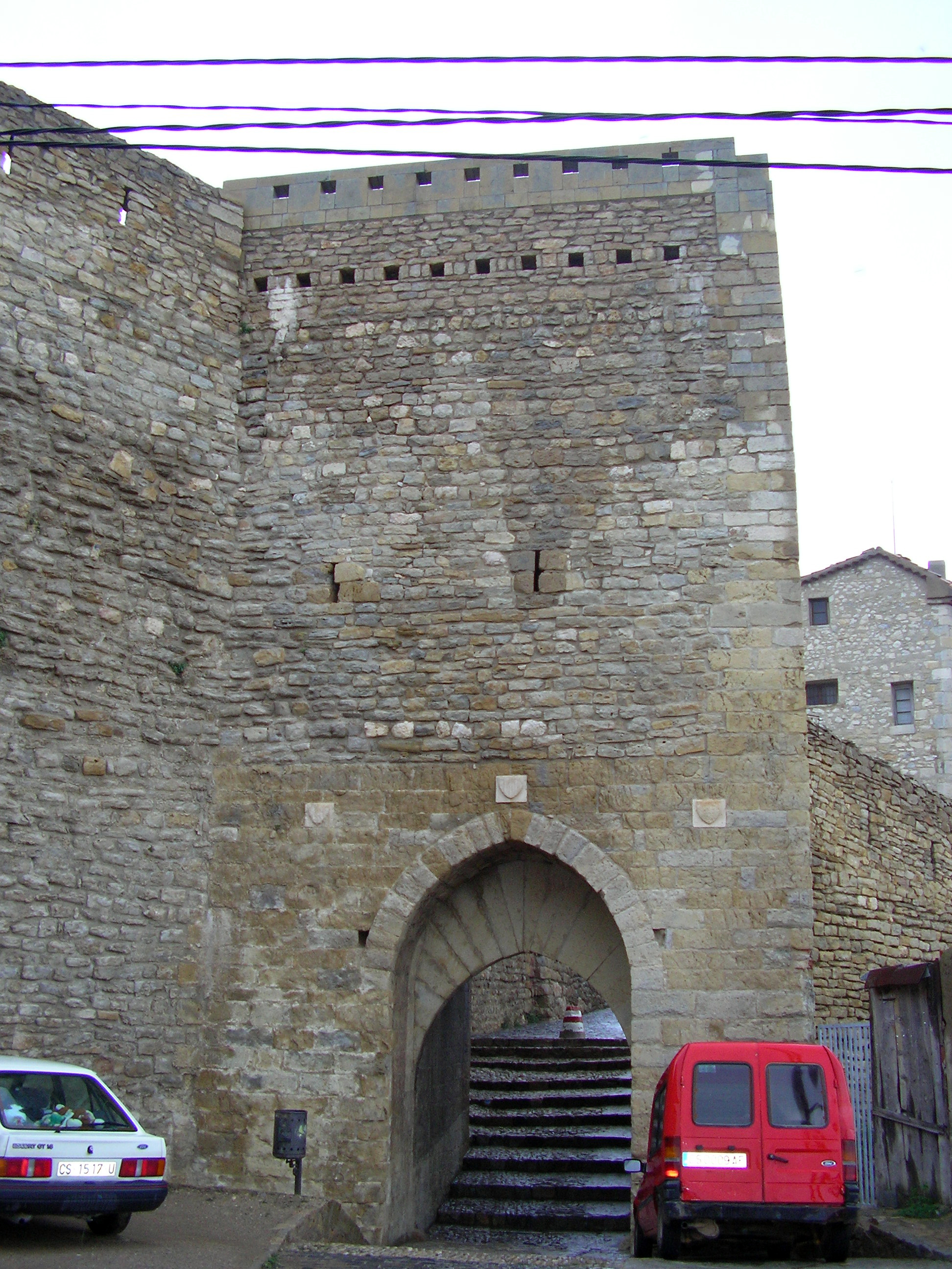 Excelentes arcos apuntados adornados con tres escudos y doble hilada de saeteras en lo más alto.